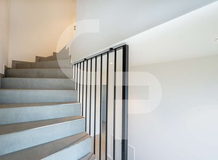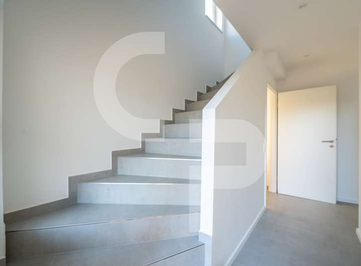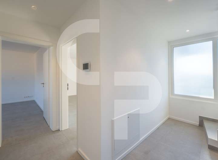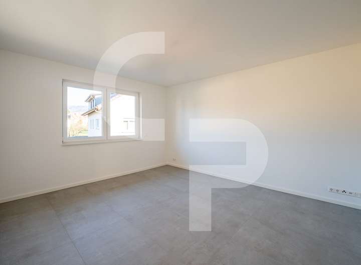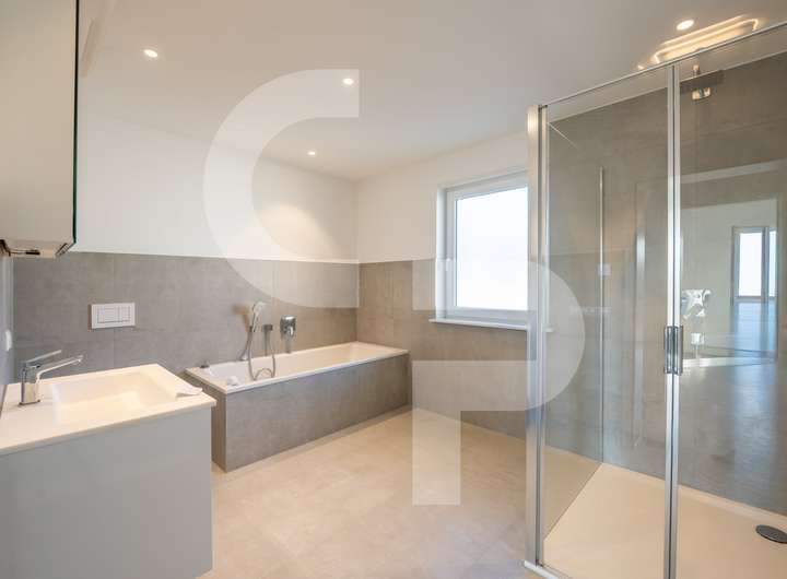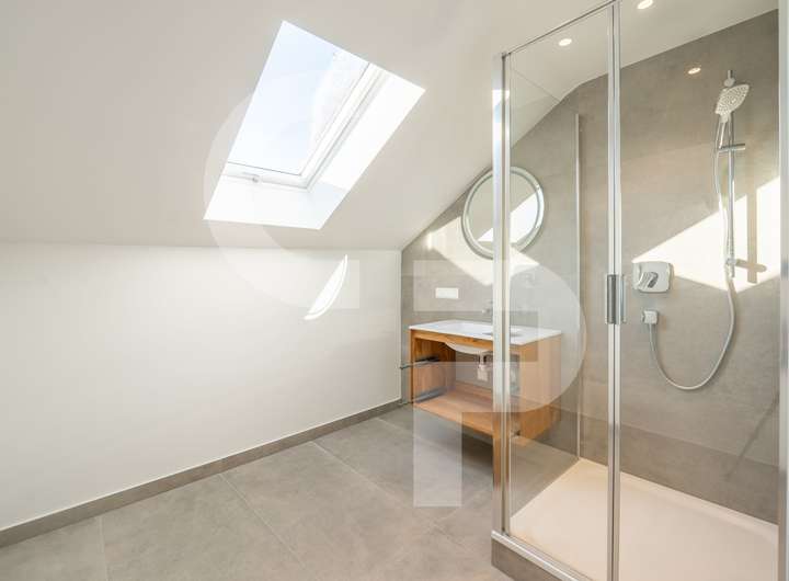 Das Obergeschoss bietet ein Schlafzimmer bzw. Kinderzimmer mit Ausrichtung nach Nord-Osten sowie ein großzügiges Hauptschlafzimmer mit separater Ankleide und Zugang zum sonnigen Süd-West-Balkon. Ein großes Tageslichtbad mit Badewanne, Dusche und Waschtisch vervollständigt diese Ebene.