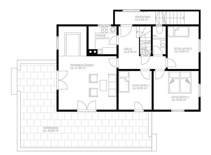 Die große Süd-West-Terrasse wird an sonnigen Tagen zum erweiterten Wohnzimmer – perfekt für lange Grillabende, entspannte Stunden im Liegestuhl oder fröhliche Familienfeste.