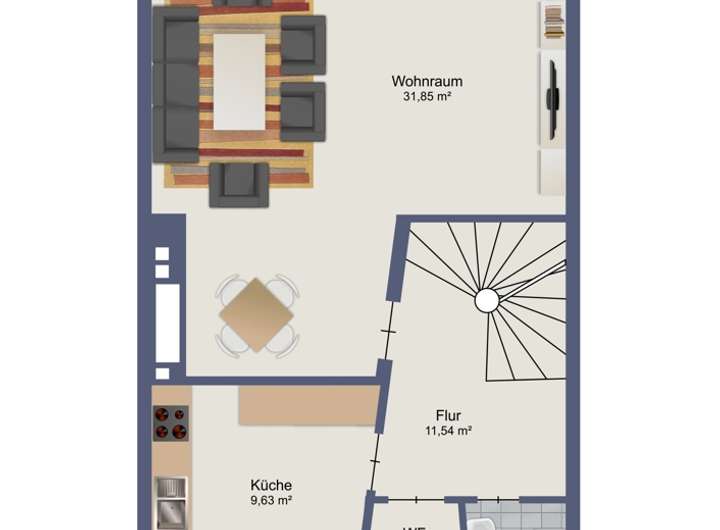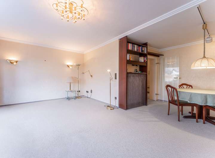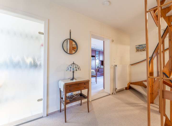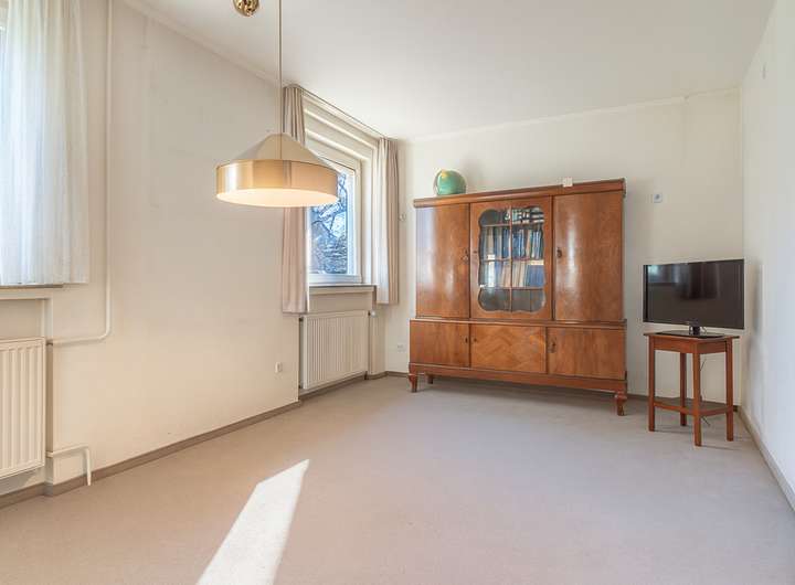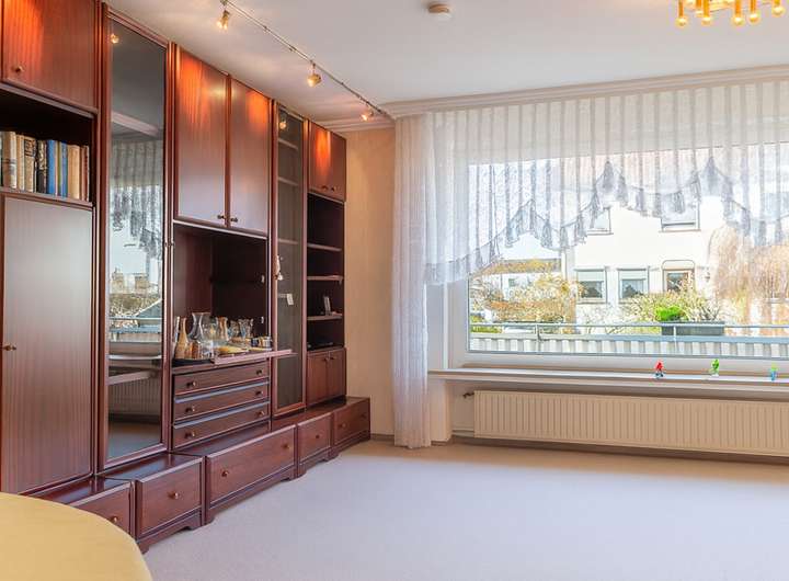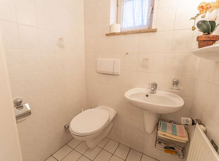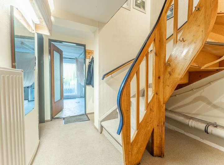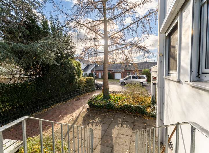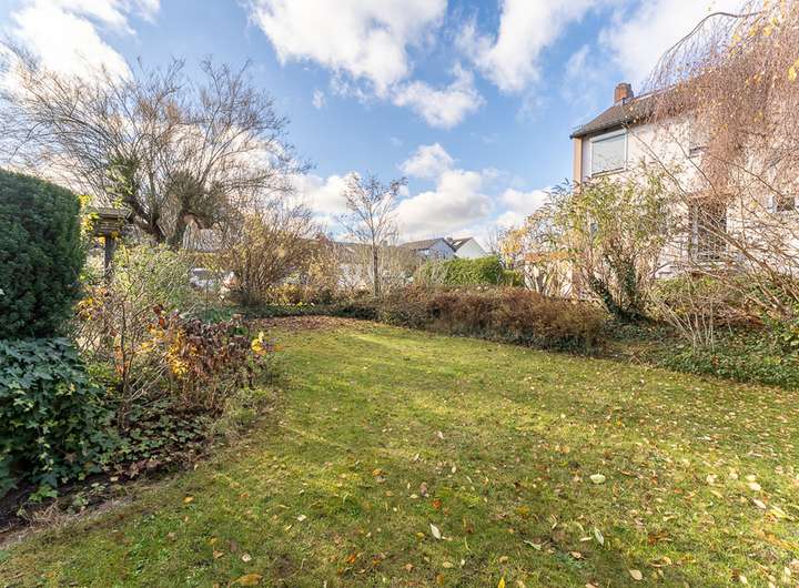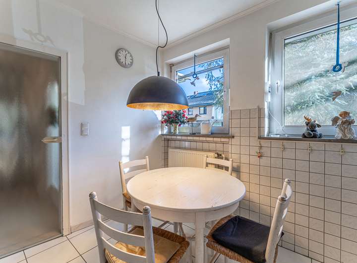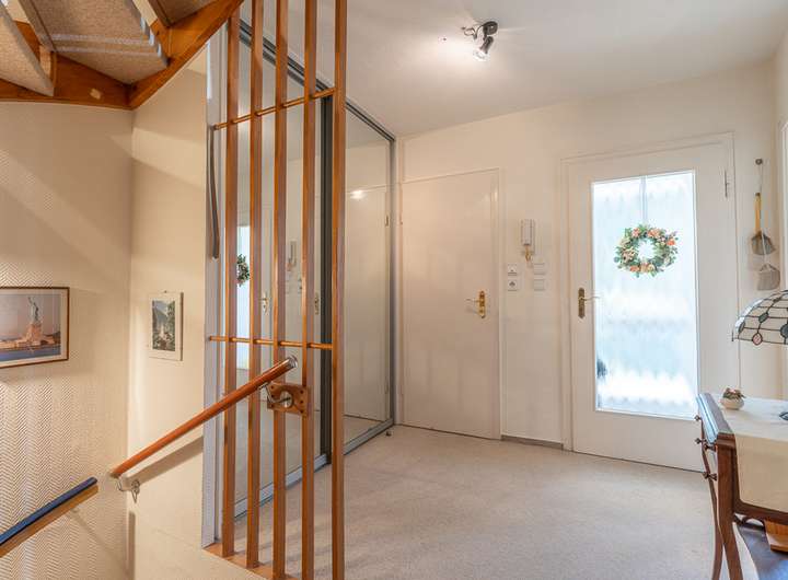 Beim Betreten des Hauses gelangen Sie zunächst über den Windfang in die großzügige Diele, die genügend Raum für eine Garderobe bietet. Im Erdgeschoss befinden sich das Gäste-WC, die Küche sowie das helle Wohnzimmer. Die Küche ist mit einer zeitlosen Einbauküche ausgestattet und verfügt über hochwertige Geräte der Marken Siemens und Miele. Das sehr gepflegte Wohnzimmer bietet ausreichend Platz für einen Essbereich. Ein großes Panoramafenster sorgt für viel Tageslicht und eröffnet den Zugang zum Balkon mit schönem Blick in den gepflegten Garten.