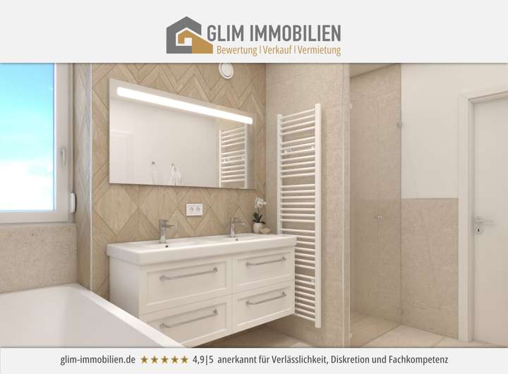 • Bodengleiche Dusche, Doppelwaschbecken, WC und Badewanne im Hauptbad