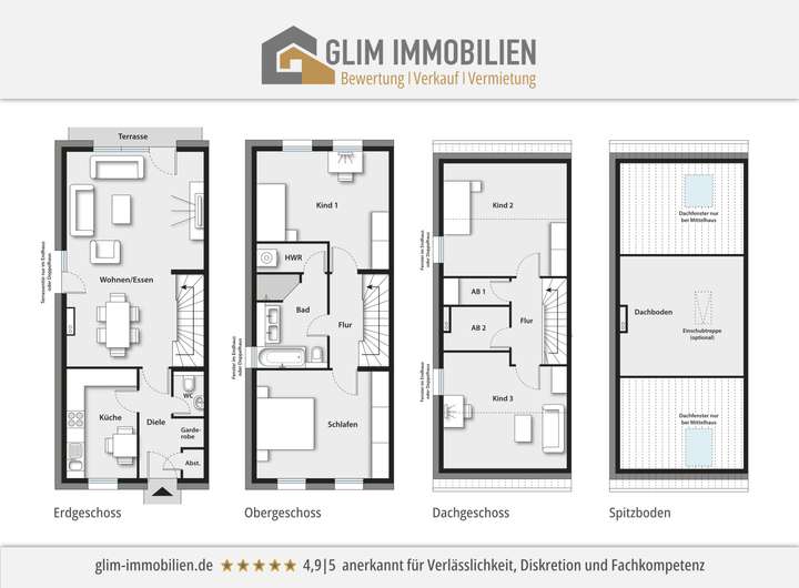 Das Dachgeschoss erweitert den Wohnraum um zwei weitere Zimmer. Diese wurden bewusst flexibel geplant und eignen sich ideal als Kinderzimmer, Jugendzimmer, Gästezimmer, Homeoffice oder Hobbyraum.