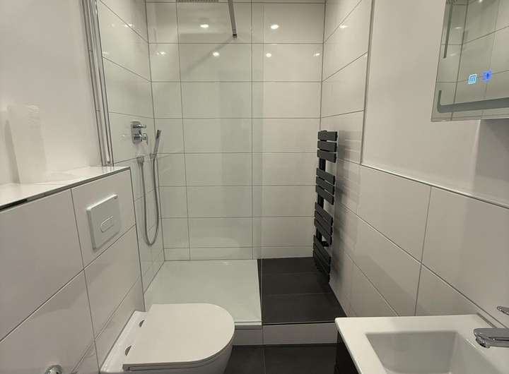 Das Badezimmer ist ein echtes Highlight, ausgestattet mit einer großzügigen Walk-in-Regendusche, einem beheizbarer Spiegelschrank, einer Glas-Duschtrennwand sowie einem Designheizkörper.
