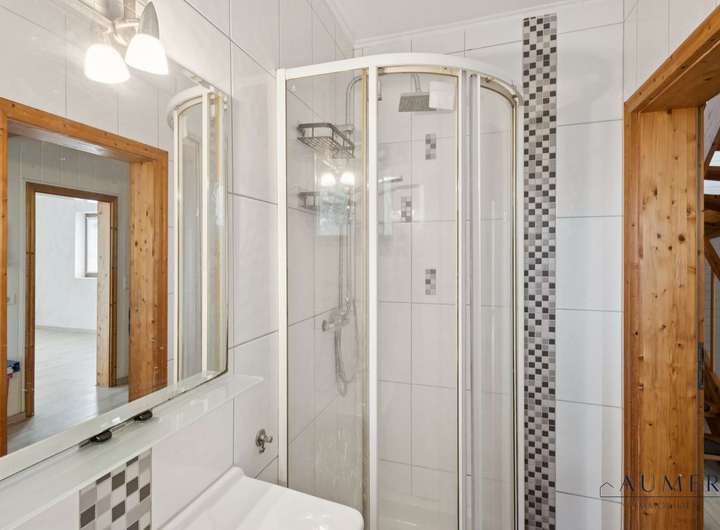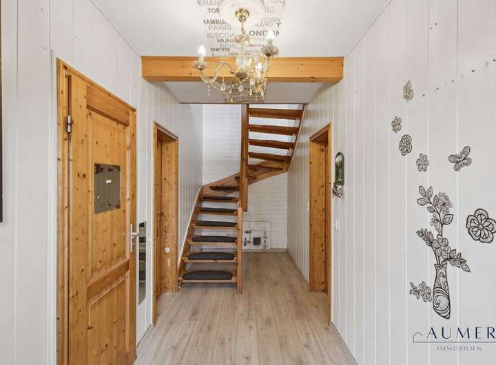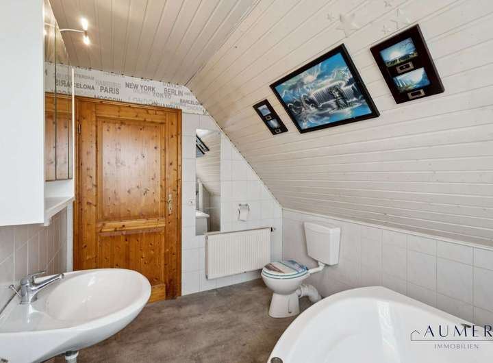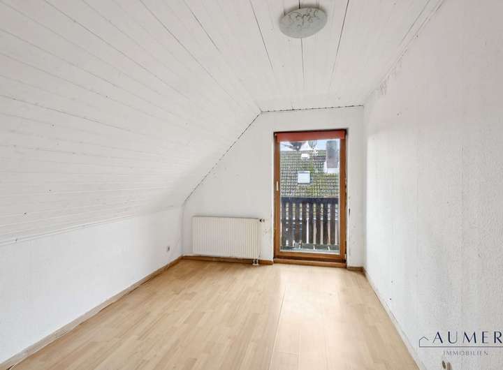 Über eine schöne Holztreppe gelangen Sie ins Obergeschoss. Hier erwarten Sie drei gut geschnittene Zimmer, vielseitig nutzbar als Elternschlafzimmer, Kinderzimmer oder Homeoffice. Ein besonderes Highlight ist der Balkon, der von zwei Räumen aus begehbar ist – ein wunderbarer Ort für den ersten Kaffee am Morgen oder entspannte Abendstunden. Das großzügige Badezimmer auf dieser Ebene verfügt über eine Badewanne sowie ein Tageslichtfenster.