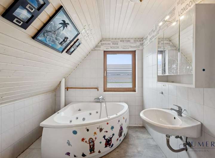 Weiterhin finden Sie im Erdgeschoss ein Tageslichtbad mit Fenster, Dusche und Handtuchheizkörper sowie einen praktischen Hauswirtschaftsraum mit zusätzlichem Stauraum.