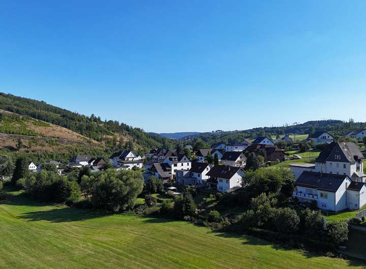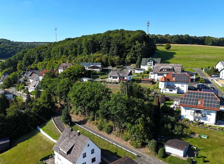 Das GrundStück oberhalb des Dorfkerns von Dillbrecht bietet eine weite Aussicht über das Dorf und die umgebende Berglandschaft des oberen Dilltals.