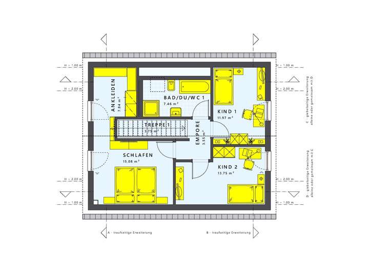 Das Herzstück des Hauses ist das klassische Satteldach, das nicht nur für ein zeitloses Design sorgt, sondern auch viel Platz für deine Photovoltaikanlage bietet. In Kombination mit einem innovativen Querhaus, das mit einem Flachdach ausgestattet ist, wird nicht nur die Fassade zu einem echten Blickfang, sondern auch der Wohnraum im Erdgeschoss und Obergeschoss vergrößert. Dadurch kannst du ein großzügiges Arbeitszimmer gestalten und in der Galerie eine gemütliche Nische für einen Schreibtisch oder eine Leseecke einrichten. Die volle Deckenhöhe sorgt für ein lichtdurchflutetes Ambiente, das dich zum Wohlfühlen einlädt.