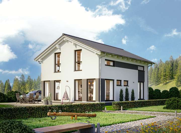 Dieses LivingHaus ist der Minimalismus in Eigenheim-Form. Das zweigeschossige Einfamilienhaus mit einem stilvollen Satteldach und einer Neigung von 38 Grad bietet viel Platz für eine Photovoltaikanlage, die dir hilft, deine Energiekosten zu senken. Im Erdgeschoss empfängt dich ein lichtdurchfluteter Wohn- und Essbereich, der durch bodentiefe Fenster und Terrassentüren eine einladende Atmosphäre schafft. Hier wird das Zusammensein mit Familie und Freunden zum Erlebnis. Darüber hinaus stehen dir ein praktisches Arbeitszimmer, die Haustechnik und ein Gäste-WC zur Verfügung. Im Obergeschoss findest du ein geräumiges Schlafzimmer mit Ankleidezimmer sowie zwei weitere Kinderzimmer, die genügend Raum für Spiel und Rückzug bieten. Das Badezimmer ist modern und funktional gestaltet und sorgt für entspannende Stunden nach einem langen Tag.