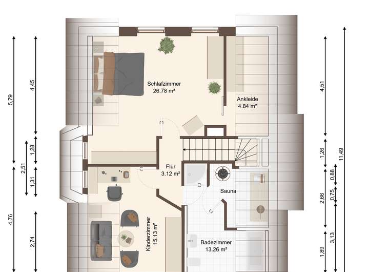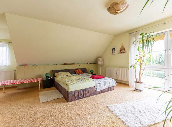 Im Dachgeschoss erwarten Sie ein äußerst komfortables Schlafzimmer mit Ankleide, ein geräumiges Kinderzimmer sowie ein großes Badezimmer mit Badewanne, Dusche und integrierter Sauna – Ihr persönlicher Wellnessbereich!