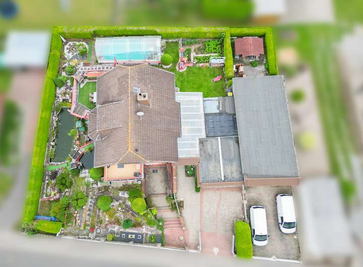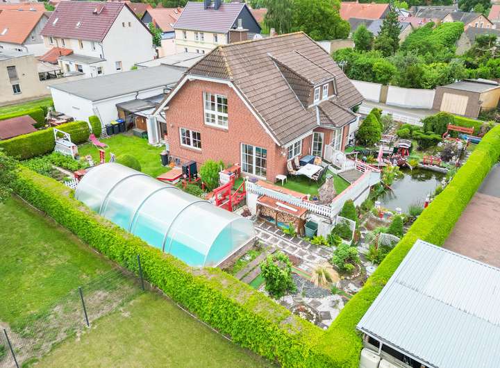 Der traumhafte Außenbereich lädt zum Verweilen ein: gepflegter Garten, überdachter Pool, Koiteich, große Terrasse, Balkon sowie eine Doppelgarage. Ein separates Lagergebäude mit eigener Zufahrt dient als Unterstellmöglichkeit und Platz für Ihr Gewerbe oder Hobby.