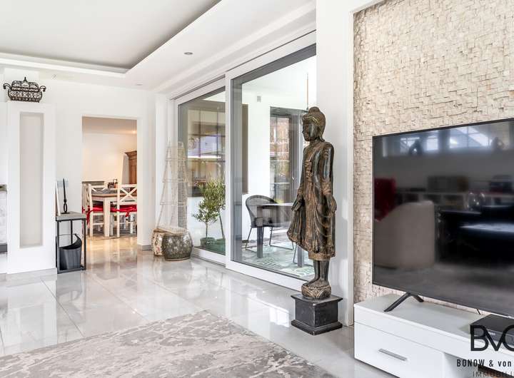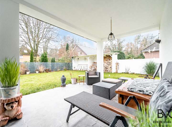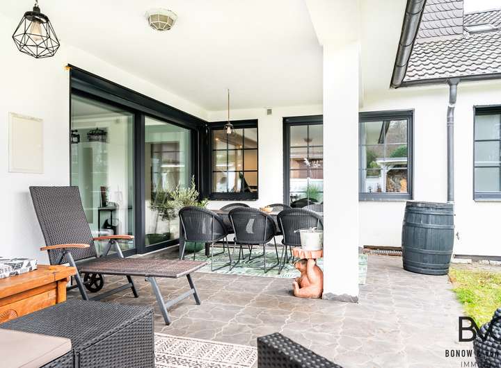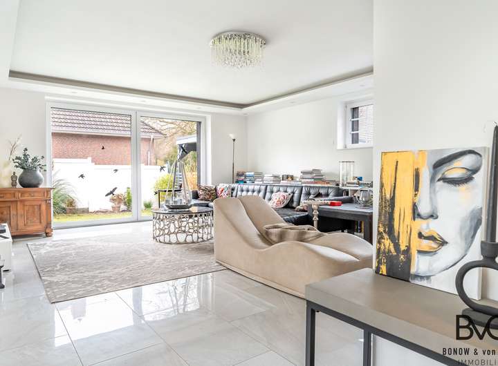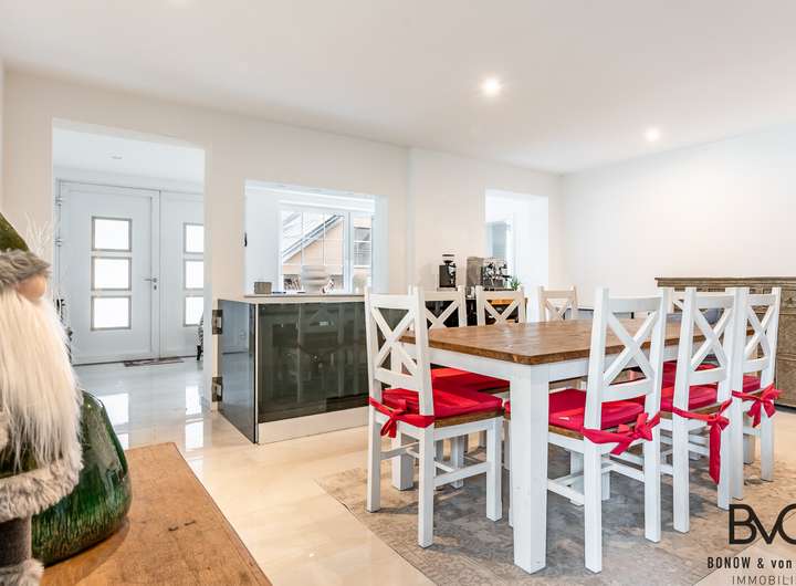 Der Eingangsbereich empfängt Sie mit einem besonderen architektonischen Charme und einer spürbaren Liebe zum Detail. Der großzügig gestaltete Flur bietet nicht nur Komfort, sondern unterstreicht sofort die hochwertige Atmosphäre, die sich durch das gesamte Haus zieht – mit ausreichend Platz für eine stilvolle Garderobe und weitere Wohnaccessoires. Der offene Wohn- und Lebensbereich ist das Herzstück des Hauses – lichtdurchflutet, einladend und perfekt für Menschen, die Wert auf Design und Raumgefühl legen. Der weitläufige Wohn- und Essbereich verbindet sich harmonisch mit der modernen Designküche samt Kochinsel. Hier entstehen unvergessliche Kochabende, herzliche Gespräche und kulinarische Momente, die jeden Hobbykoch begeistern. Der angrenzende Wohnbereich mit gemütlicher Couch- und Multimediaecke sowie Kamin schenkt Wärme und Geborgenheit – besonders an kühleren Tagen ein Ort voller Wohlgefühl und Entspannung. Über ein elegant integrierte Fensterschiebeelement gelangen Sie auf die überdachte Terrasse mit ihrem herrlichen Blick in den liebevoll angelegten Garten. Dieser Bereich ist wie eine Erweiterung des Wohnzimmers – ideal für entspannte Stunden, während Kinder ausgelassen spielen oder Ihre Vierbeiner das Grün genießen. Hobbygärtner finden hier einen Außenbereich, der ihnen vielfältige Möglichkeiten für kreative Gestaltungsideen und liebevoll gepflegte Gartenmomente eröffnet.