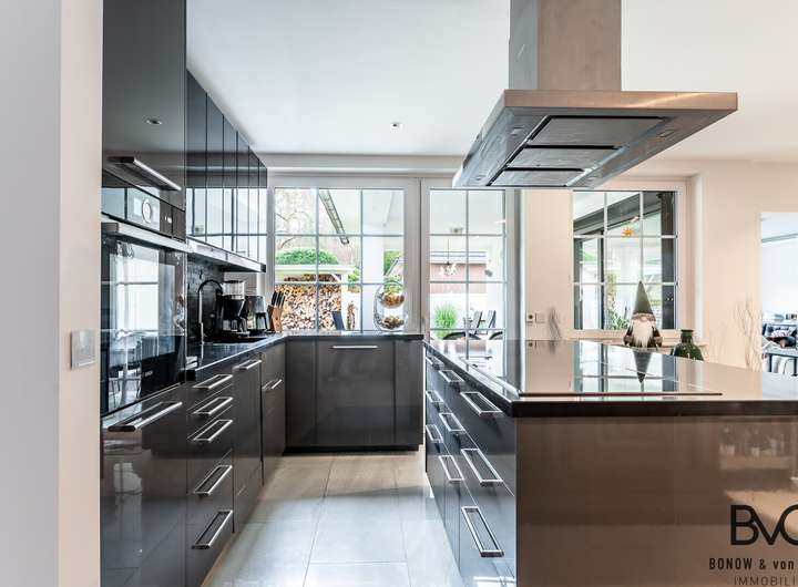 - Moderne Einbauküche mit Kochinsel (Markeneinbaugeräte Bosch)