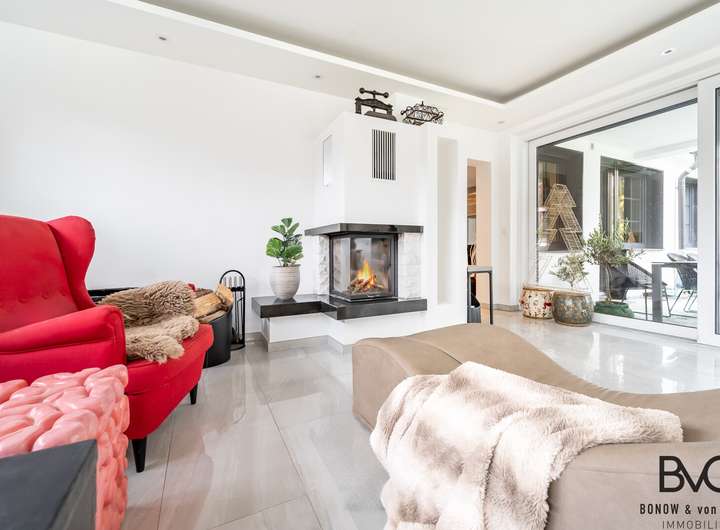 - Wohnzimmer mit Kamin und Zugang zur Terrasse