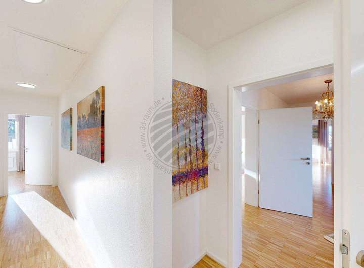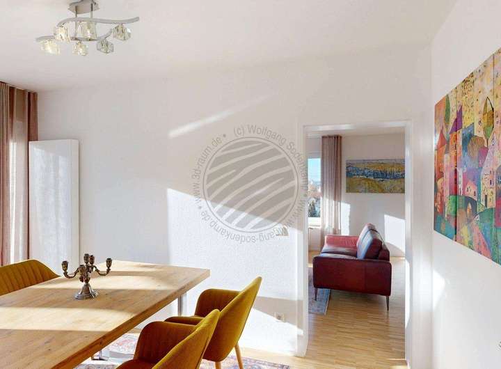 Die Hauptebene überzeugt durch eine angenehme Offenheit und eine harmonische Raumabfolge. Große Fensterflächen sorgen für viel Tageslicht und einen schönen Blick ins Grüne.