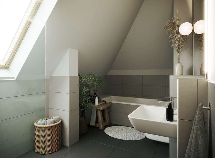 Edles Eichenholz-Parkett verleiht den Wohn- und Schlafbereichen eine warme, natürliche Ausstrahlung und sorgt in Verbindung mit der Fußbodenheizung für behagliches Wohngefühl. Das Badezimmer vereint moderne Eleganz mit wohltuender Ruhe. Hochwertige Sanitärelemente, großformatige Fliesen und puristische Gestaltung schaffen einen Ort des Rückzugs.