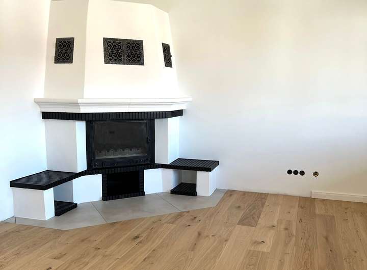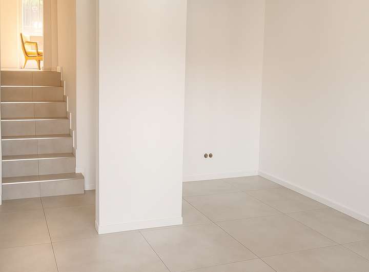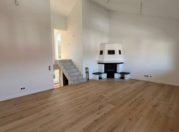 Bereits beim Betreten überzeugt das Haus durch seinen durchdachten Eingangsbereich mit großformatigen Bodenfliesen und splitlevel "Treppenhaus". Der offen gestaltete Wohnbereich im Obergeschoss begeistert mit warmem Echtholzboden und einem Kamin, der eine gemütliche Atmosphäre schafft. Große Fenster lassen viel Tageslicht herein und bieten einen harmonischen Übergang zum Balkon – ideal für entspannte Stunden im Freien.