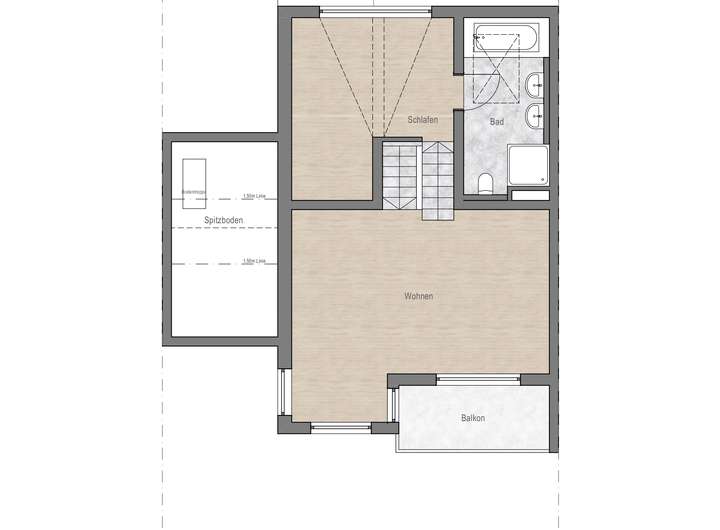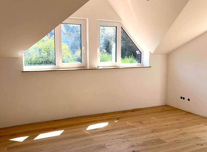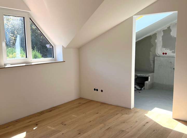 Im Dachgeschoss erwartet Sie ein großzügiger, ruhiger Raum mit charakteristischer Dacharchitektur und großen Fenstern, die eine helle und freundliche Stimmung erzeugen. Der hochwertige Parkettboden rundet das stilvolle Ambiente ab und eignet sich perfekt als Schlafzimmer. Ein En-Suite-Bad schließt sich direkt an das Schlafzimmer an und unterstreicht den besonderen Wohncharakter der Immobilie.