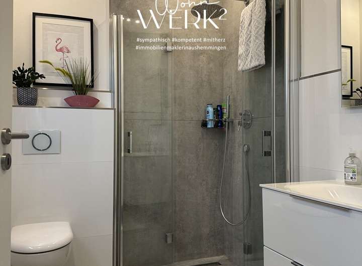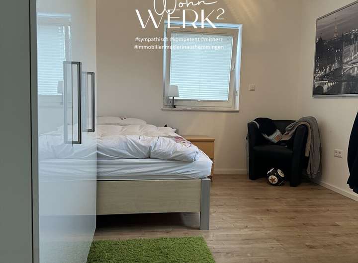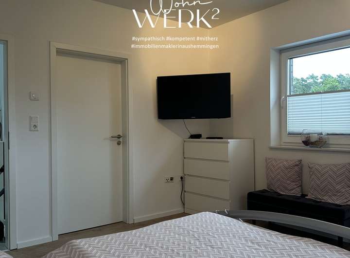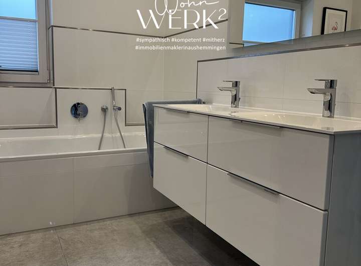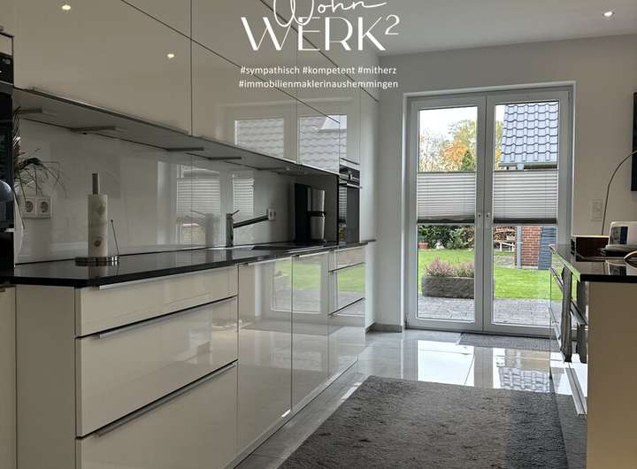 Die hochglanzweiße Einbauküche mit modernen Markengeräten fügt sich perfekt ins Raumkonzept ein und kann übernommen werden. Ergänzt wird das Erdgeschoss durch ein Gäste-WC mit ebenerdiger Dusche sowie ein großzügiges Gästezimmer oder Büro, ideal für Besucher oder Homeoffice.