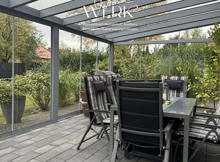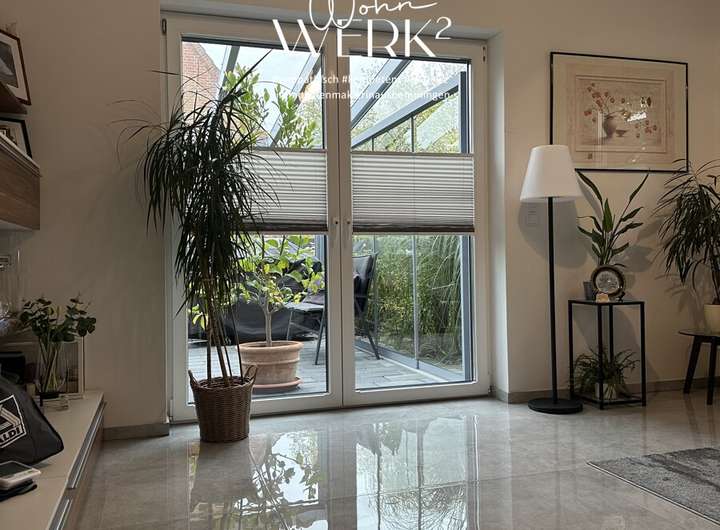 Ein besonderes Highlight ist der Wintergarten in einheitlicher Farbgestaltung, der als „kalter Wintergarten“ ausgeführt wurde. Er erweitert den Wohnraum optisch und schafft einen geschützten, hellen Bereich für entspannte Stunden zu jeder Jahreszeit.