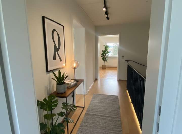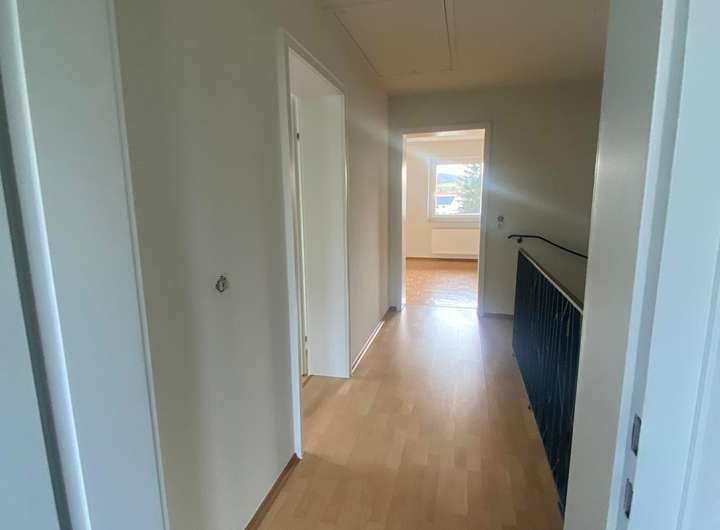 Obergeschoss: Flur mit Treppenabgang mit Zugang zum Kinder- oder Arbeitszimmer sowie großem Schlafzimmer (ca. 22 qm) mit direktem Zugang zum zweiten Südbalkon. Ebenfalls das zweite modernisierte Bad auf dieser Etage.