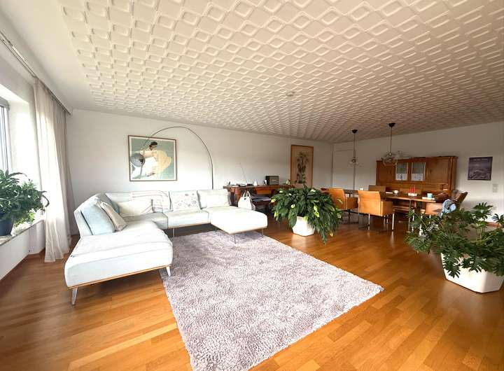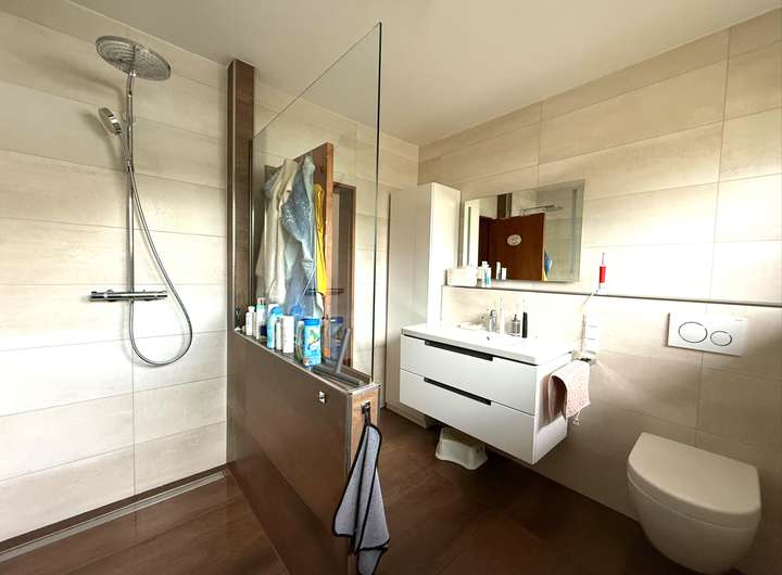 Ebenfalls auf der linken Seite öffnet sich der großzügige Wohn-, Ess- und Küchenbereich mit direktem Zugang zur sonnigen Südterrasse und dem schön angelegten Garten – ein perfekter Ort zum Entspannen oder für gesellige Stunden mit Familie und Freunden.