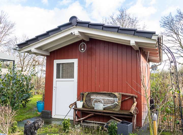 Ein flexibel nutzbarer Container-Schuppen bietet zusätzlichen Stauraum oder kann als Werkstatt und Hobbyraum genutzt werden. Zusätzlich steht Ihnen ein kleines Gartenhaus zur Verfügung.