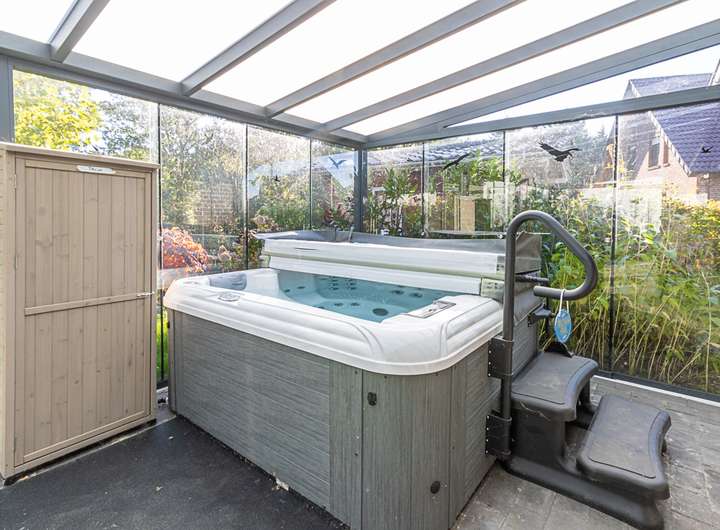 Das Herzstück des Bungalows bildet das geräumige Wohnzimmer, das mit seiner einladenden Atmosphäre zum Verweilen einlädt und Sie zudem den Zugang zum Kaltwintergarten und dem Whirlpool haben, welcher zu erholsamen Stunden im Freien einlädt.