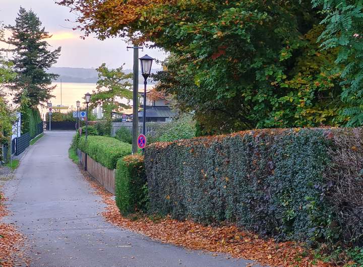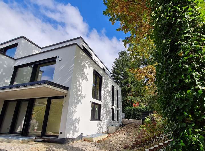 Im Obergeschoss befindet sich ein grosszügiger Wohn-Essbereich mit offener Küche und separatem WC. Abgerundet wird das Obergeschoss mit einem großen Balkon mit Glasgeländer. Das Dachgeschoss beinhaltet ein helles, großes Zimmer mit Bad und bodentiefer Dusche. Von der zweiseitigen Dachterrasse genießen Sie einen fantastischen Blick in den alten Baumbestand - im Winter reicht der Blick bis zum Wörthsee.