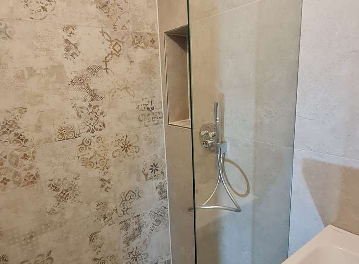 ***Zwei Bäder mit bodentiefen Duschen in Naturstein***