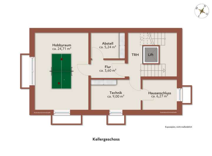 Der Grundriss erstreckt sich über ca. 166 m². Das Kellergeschoss bietet Ihnen einen vielseitigen Hobbyraum mit ca. 25 m² neben einem Abstellraum, Technik-, und Hausanschlußraum. Das Erdgeschoss umfasst 3 Zimmer samt Ankleidezimmer und einem Bad mit bodentiefer Dusche.