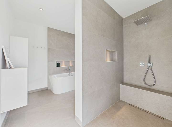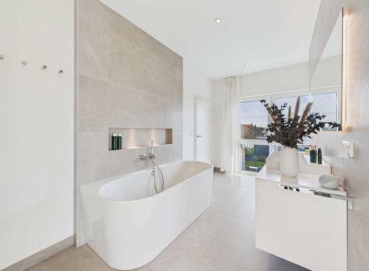 Im Obergeschoss setzt sich die großzügige Lichtgestaltung fort. Ein heller Flur führt in das Hauptschlafzimmer mit direkter Verbindung zur maßgefertigten Ankleide. Zwei weitere Zimmer bieten vielseitige Nutzungsmöglichkeiten als Kinderzimmer, Büro oder Gästezimmer. Das stilvolle Masterbad überzeugt mit Sanitärobjekten von Villeroy & Boch, hochwertigen Keuco-Armaturen und geschmackvollen LED-beleuchteten Nischen, die eine entspannende Spa-Atmosphäre schaffen. Das gesamte Obergeschoss wurde vollständig in Trockenbauweise errichtet, wodurch eine flexible Anpassung der Raumstruktur jederzeit möglich ist. Die Zwischendecke zum Dachgeschoss ist sorgfältig gedämmt und schafft zusätzliche energetische Effizienz.