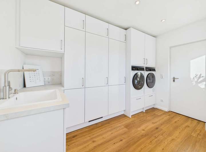 Bereits das Untergeschoss zeigt die besondere Ausstrahlung des Hauses: Ein lichtdurchfluteter Flur mit Betontreppe und eleganten Glaselementen schafft einen modernen, offenen Empfangsbereich. Ein Gäste-WC mit Dusche bietet praktischen Komfort für Besucher. Der Hauswirtschaftsraum ist mit maßgefertigten Einbauschränken und einer Waschmaschine ausgestattet und dient zugleich als direkter Zugang zur Garage, sodass man das Haus auch bei schlechtem Wetter trockenen Fußes betreten kann. Ein weiterer Raum beherbergt die effiziente Luftwärmepumpe, die gemeinsam mit der im gesamten Haus verlegten Fußbodenheizung ein angenehm temperiertes Wohnklima sicherstellt. Der großzügige Wohn- und Essbereich mit offener Küche bildet das kommunikative Zentrum des Hauses. Die hochwertige Einbauküche verfügt über Geräte von Miele und NEFF, zum Teil app-gesteuert, und fügt sich harmonisch in das elegante Wohnkonzept ein.