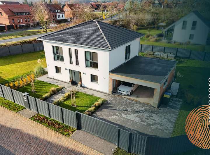 Das integrierte Smart-Home-System ermöglicht die Steuerung sämtlicher Rollläden, der Beleuchtung sowie zahlreicher Küchengeräte per App. Dimm- und programmierbare Deckenspots schaffen im ganzen Haus eine angenehme Lichtstimmung, während elegante Treppenspots für ein stimmiges Abendambiente sorgen. Auch die Außenbeleuchtung lässt sich dank Philips-Hue-Technik farblich variieren und bequem digital anpassen. Für Sicherheit sorgen Kameras auf allen vier Hausseiten, optional mit Alarmfunktion, sowie eine Gegensprechanlage an der Eingangstür. Ein Glasfaseranschluss gewährleistet eine zukunftssichere, leistungsstarke Internetverbindung. Darüber hinaus ist das Gebäude bereits für eine Photovoltaikanlage vorbereitet.