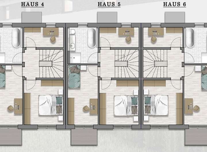 Die sechs Reihenhäuser sind klar auf Funktionalität und Ästhetik ausgerichtet und bieten großzügige Wohnflächen in einer harmonischen Nachbarschaft. Jedes Reihenhaus erstreckt sich über zwei Etagen plus nicht ausgebautes Dachgeschoss und zeichnet sich durch eine offene, lichtdurchflutete Raumgestaltung aus. Der Wohn- und Essbereich im Erdgeschoss öffnet sich zu einem privaten Garten und schafft Raum für persönliche Entfaltung und gemütliche Stunden. Hochwertige Materialien und durchdachte Grundrisse sorgen dafür, dass die Bewohner sich sofort zu Hause fühlen.