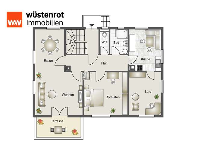 Erdgeschoss: Eine geräumige 4-Zimmer-Wohnung mit Küche, Bad und separater Toilette. Von hier aus haben Sie direkten Zugang zur sonnigen Terrasse, die sich ideal für entspannte Stunden im Freien eignet.