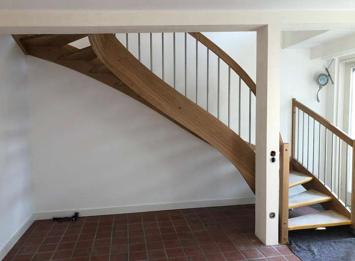 Kopfseitig ist das großzügige Wohn & Esszimmer mit Holztreppenhaus begehbar.