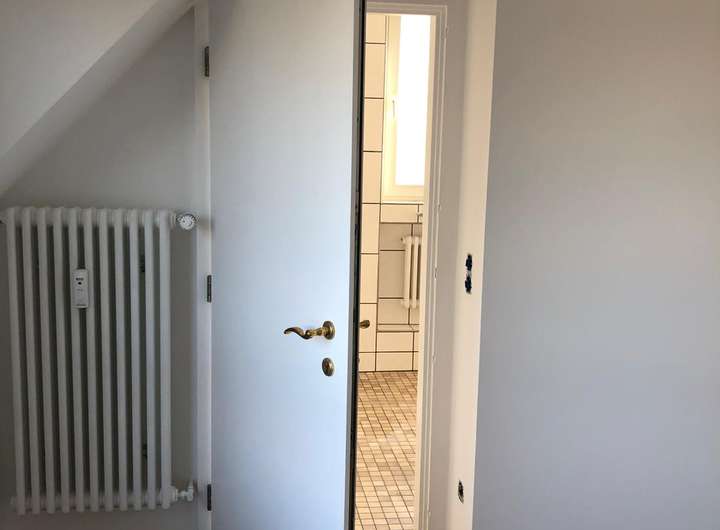 Im ersten Obergeschoss ist straßenseitig das geflieste Bad zu finden. Das Fensterbad wird über ein Dachflächenfenster belichtet. Weiterhin sind hier zwei Schlafzimmer zu finden. Die Schlafräume sind allesamt mit Rollläden ausgestattet.