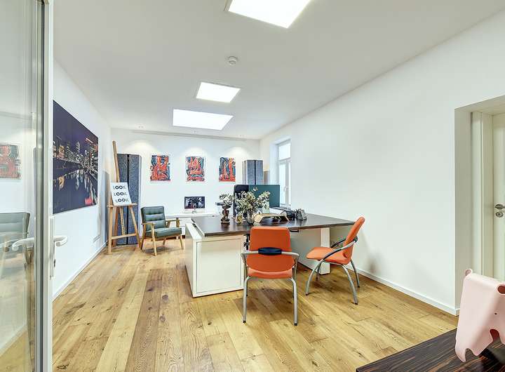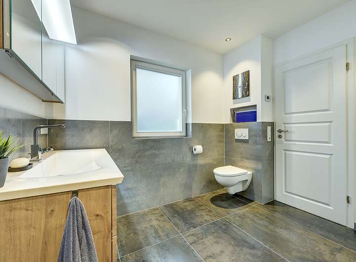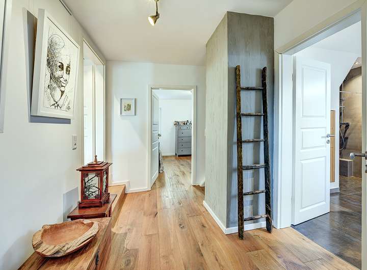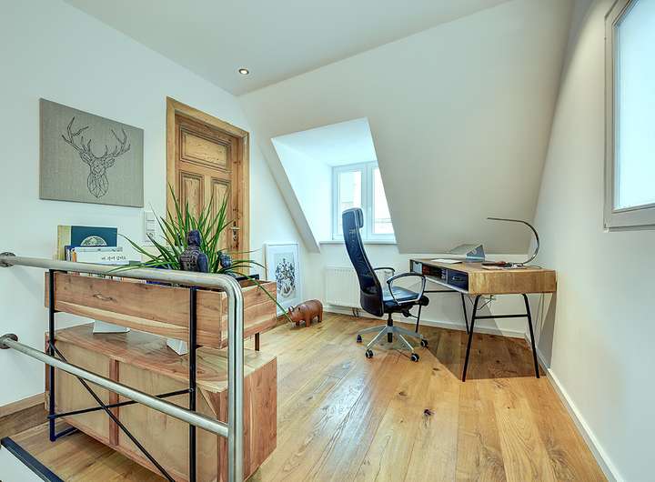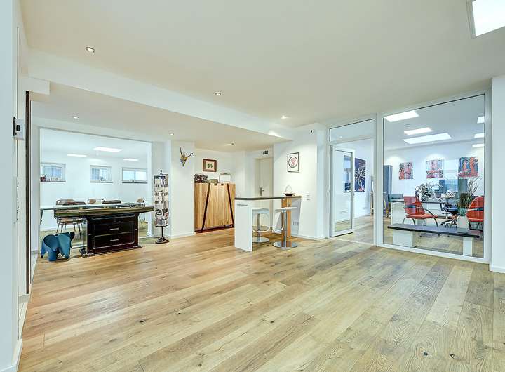 Ein besonders hervorzuhebendes Merkmal des Hauses ist die gut durchdachte Raumaufteilung. Ob Wohnhaus in Kombination mit einer Büroeinheit oder Wohnhaus mit Einliegerbereich, die neun Zimmer verteilen sich auf mehrere Ebenen und bieten viel Freiraum zur individuellen Gestaltung. Großzügige Zimmer bieten Rückzugsorte von außergewöhnlicher Qualität. Puristische Eleganz und hochwertige Materialien prägt das Badezimmer, das sich im Bereich des Wohnhauses mit modernen Armaturen und stilvollen Fliesen ein besonderes Highlight darstellen. Moderne Technik, eine Zentralheizung und die Ausstattung auf höchstem Niveau ergänzen das attraktive Wohnkonzept.