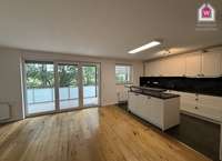 Die stilvolle Einbauküche mit hochwertigen Elektrogeräten fügt sich harmonisch in das moderne Wohnkonzept ein. Der edle Parkettboden unterstreicht das gehobene Ambiente, während elektrische Rollläden zusätzlichen Komfort bieten.