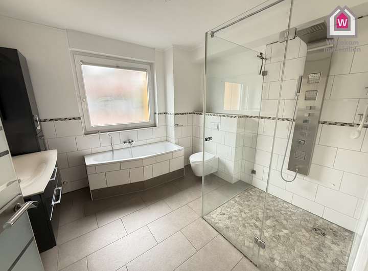 Das helle Badezimmer überzeugt mit einer ebenerdigen Dusche, einer großzügigen Badewanne sowie hochwertigen Sanitärobjekten. Ein separates Gäste-WC ergänzt das Raumangebot ideal.