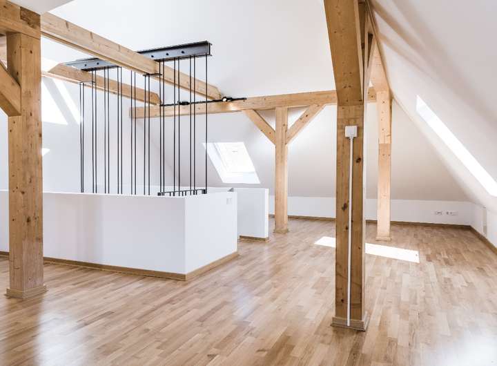 Im Dachgeschoss befindet sich ein großzügiges Studio, welches eine Menge Platz zum Entfalten bietet.