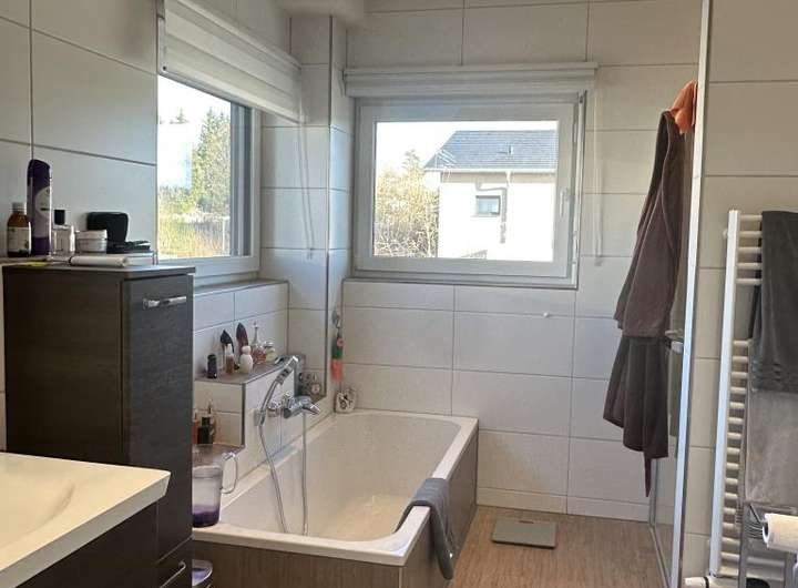 Das Tageslichtbad ist mit einer bodenebenen Dusche, einer Badewanne, sowie modernen Armaturen ausgestattet und bietet ein gehobenes Wohlfühlambiente. Ein separates WC im Erdgeschoss ergänzt die durchdachte Raumplanung.
