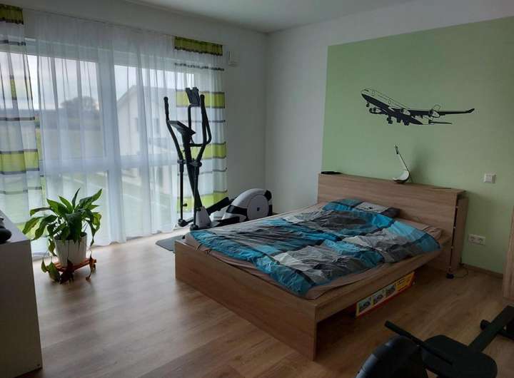 Das Haus verfügt über ein komfortables Schlafzimmer mit angrenzender Ankleide (mit Wäscheabwurfschacht) – perfekt für ein strukturiertes und aufgeräumtes Wohnumfeld.