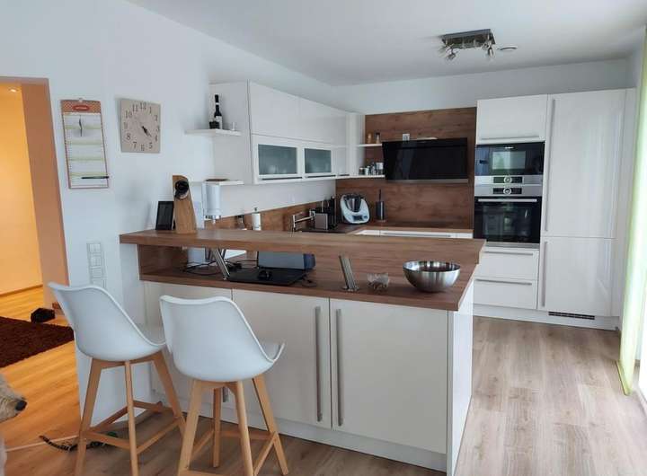 Die hochwertige Küche fügt sich harmonisch in das moderne Gesamtbild ein.