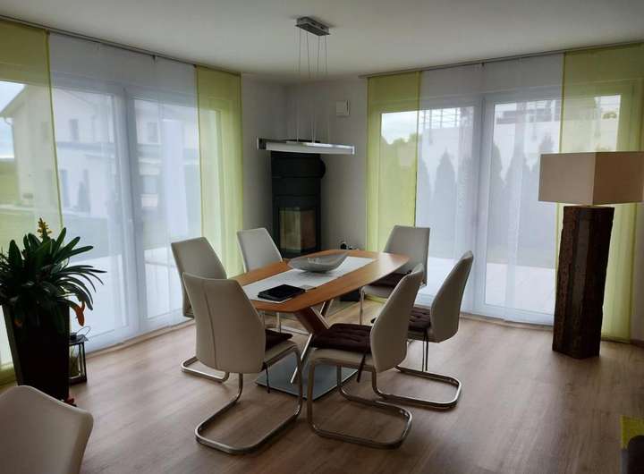 Der großzügige Wohn- und Essbereich bildet das Herzstück des Hauses. Große Fensterflächen eröffnen einen weiten Blick in die umliegende Natur und schaffen eine helle, freundliche Atmosphäre. Ein eleganter Kaminofen sorgt zusätzlich für behagliche Wärme sowie ein stilvolles Wohngefühl.