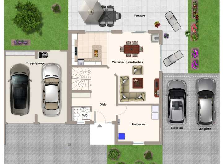 Der Außenbereich ist pflegeleicht gestaltet und bietet viel Raum für entspannte Stunden im Freien. Die nach Süden hin ausgerichtete Sonnenterrasse mit zirka 60 m², bietet Sonne von morgens bis in die Abendstunden. Eine Doppelgarage rundet das Angebot ab und bietet ausreichend Platz für Fahrzeuge, Fahrräder oder Hobbyequipment.
