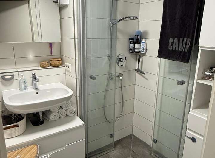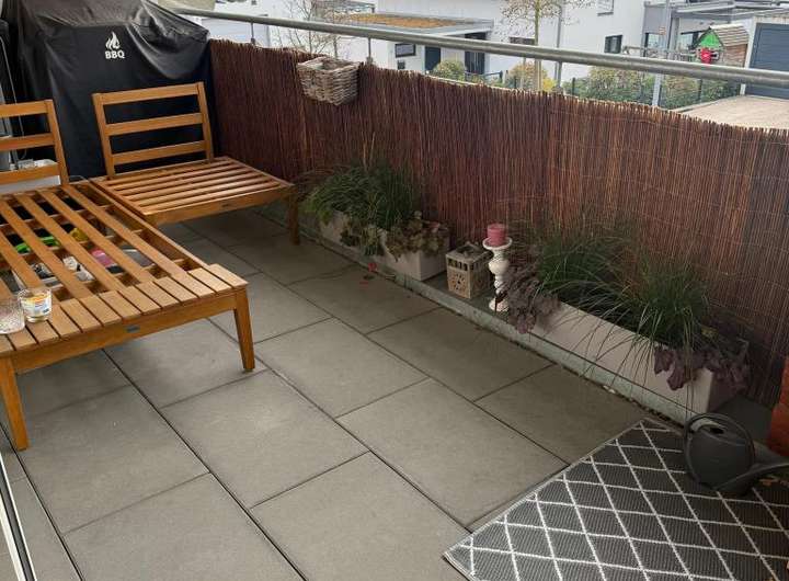 Die moderne Einbauküche mit hochwertigen Geräten sowie das stilvolle Badezimmer mit bodentiefer Dusche sorgen für hohen Wohnkomfort. Das helle Wohnzimmer bietet direkten Zugang zum Balkon, der zum Entspannen einlädt.