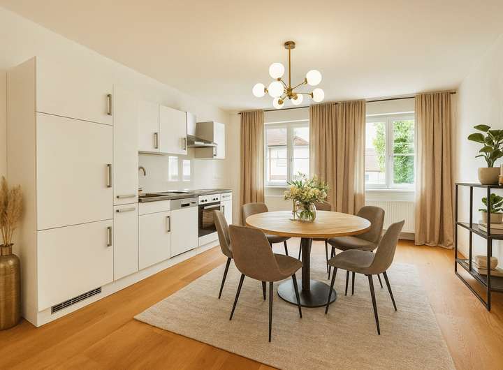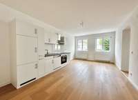 Der großzügige Küchenbereich mit neuer Einbauküche inklusive aller modernen Elektrogeräte und integriertem Essplatz bildet das Herzstück der Wohnung. Hier verbinden sich Kochen, Genießen und Geselligkeit auf schönste Weise. Das große, helle Wohnzimmer lädt mit seinen freundlichen Fensterfronten zum Entspannen ein und bietet viel Platz für Ihre individuellen Wohnideen. Zwei gemütliche Schlafzimmer schaffen private Rückzugsorte, während das geräumige, modern gestaltete Badezimmer mit Waschmaschinenanschluss Komfort und Funktionalität vereint. Zusätzlich gibt es ein separates Gäste-WC für noch mehr Alltagstauglichkeit.