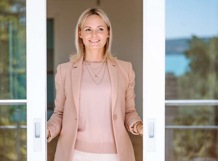Vinylboden in warmer Holzoptik & moderne Querformat-Fliesen