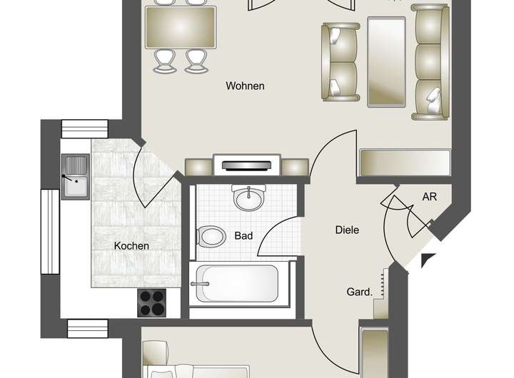 Die 2-Zimmerwohnung befindet sich im 1. Obergeschoss und verfügt über eine Diele, von dieser erreichen Sie alle Räume, ein Schlafzimmer, eine Küche, ein Badezimmer sowie ein geräumiges Wohn- und Esszimmer mit Zugang zum Balkon in West-Ausrichtung.