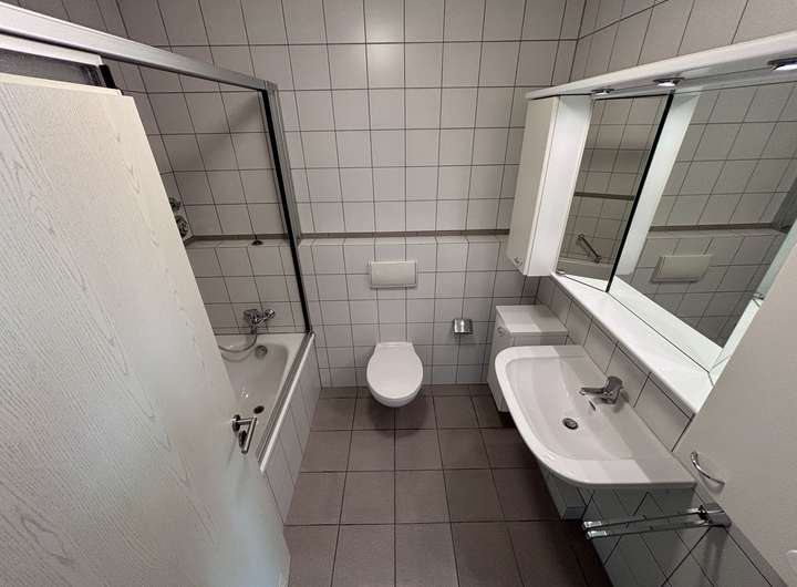 Das Badezimmer wurde an Wänden und Boden weiß gefliest und mit einer Badewanne, einem WC und einem Waschbecken ausgestattet. Sämtliche Sanitärgegenstände wurden in weiß gehalten.